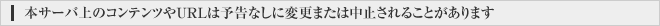サーバのセキュリティについては、相当の注意を払っておりますが、サーバ等の誤作動による機械的な瑕疵、 その他、不可抗力により本ウェブサイトが正常に作動しないことがあることを、あらかじめご了承下さい。 また、本サーバ上のコンテンツの内容についての妥当性、正確性等に関し何ら保証するものではなく、一切の責任を負い兼ねます。また、コンテンツの内容を変形、変更、加筆修正することは一切お断りします。